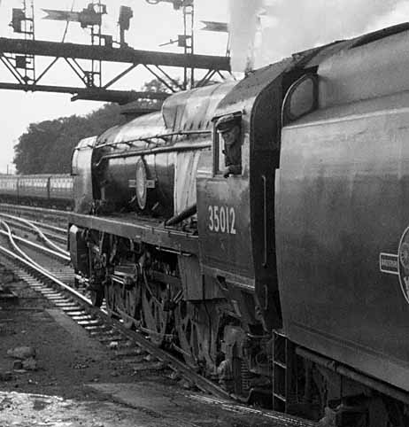 ![]() Nine Elms driver 'Dick' Turpin leans out of the cab of 35012 "United States Lines" waiting to leave Southampton on 6th September 1962 with the down Royal Wessex, the 16.35 Waterloo to Weymouth train. (Photo copyright Bryan Benn)
