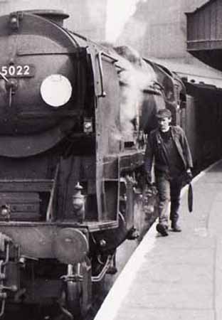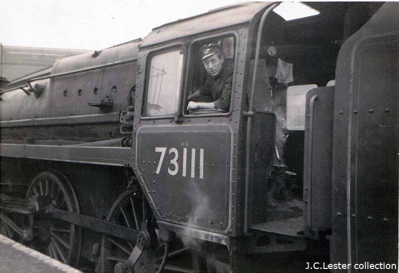 ![]() Peter Steward is seen here on Standard Class '5' No. 73111 'King Uther' at Waterloo in 1959. Some of these engines were fitted with re-cast name plates that were carried by withdrawn original King Arthur Class ('N15') locomotives, this one from No. 30737. (Photo J. C. Lester collection)