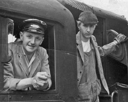 ![]() Harry Tester (left) and Jim Lester on the footplate of Nine Elms allocated Class '700' No. 30694 in Feltham's East End Yard in 1960. (Photo B. Tipping).