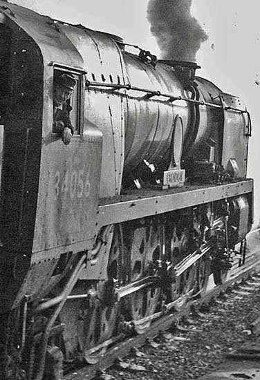 The photo below is Peter Roberts in charge of 34052 (aka 34046) at Winchfield 8th July 2017. (Copyright John McIvor) ![]() Nine Elms locomotive, Class MN, 4-6-2, No. 35014 'Nederland Line', pauses at Brockenhurst on the Up where (left) driver Jim Robinson Senior and his fireman Peter Roberts are seen in this rather atmospheric photograph. (Photo Peter Roberts collection)