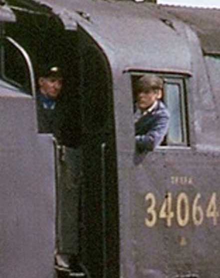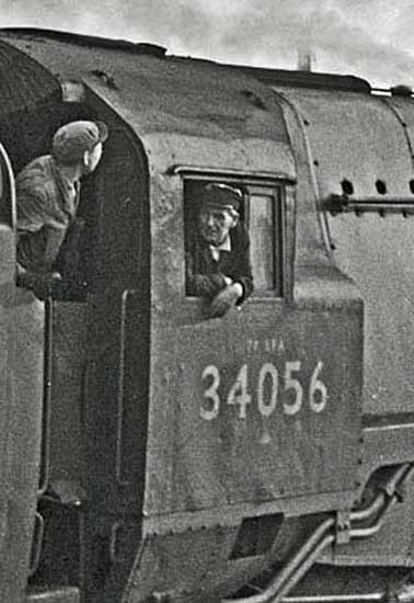 ![]() Fireman John Wild seated at the window of 34064 'Fighter Command' at Waterloo with driver 'Spot' King on the left. (Photo © Bill Wright)