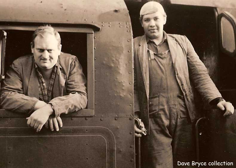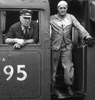 ![]() Driver Eric Saunders (left) with fireman Alan Rowe on board 35005 in 1965 (photo copyright Dave Sprackland). Alan Sanson - click here for photograph ![]() Driver Charlie Slimmon (left) and his fireman Barry Mackett are seen here in the late 1950's on the footplate of class BB No. 34053 'Sir Keith Park'. . (Photo J.C.Lester collection)