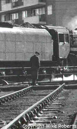 ![]() Len Trigg stands by 73111 at the Nine Elms turntable. (Photo copyright Mike Roberts)