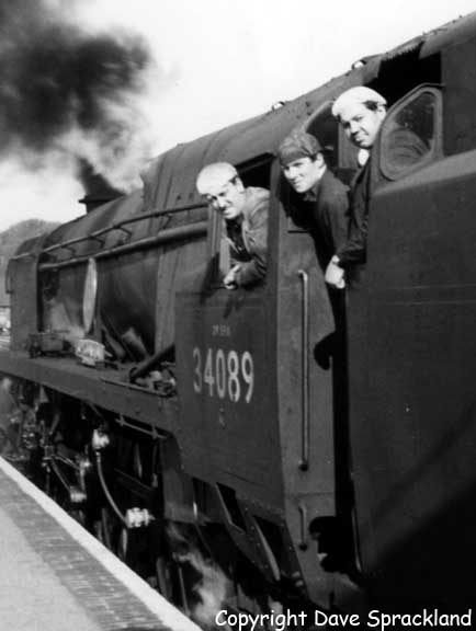 ![]() Brian Smith (centre) with Tom Moult (right) and Gordon Porter (left) on board 34089 (photo copyright Dave Sprackland).