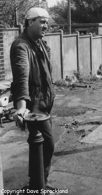 ![]() Nine Elms driver Mick Rickman holding the water bag. (Cropped image from photo copyright Les Kent, via Alan Newman)