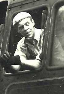 ![]() Driver Peter Shackleton seen on board a Bulleid Pacific in about 1958. His daughter Janet sent this picture of her Dad, writing to the Nine Elms website telling us that he has enjoyed looking at the photos of his colleagues. She said that the pictures brought back happy memories for him. (Photo Janet Watts collection)