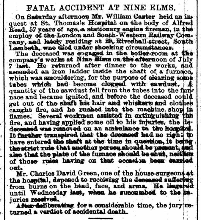 I wonder if you could help with some family research I am undertaking. Below is a copy of a report relating to the death of my great, great grandfather Alfred Read who died following an accident at Nine Elms locomotive works on the 7th July 1885. In the report he is described as a 'stationary engine fireman' although in the 1881 census he was described as a 'railway engine driver' as indeed he was similarly described on his marriage certificate in 1853. I would be very interested to know what a 'stationary engine fireman' was employed to do and also if you have any information relating to the furnaces within Nine Elms, and again what they were used for. What is the 'plate of the furnace' which should have been 'shut'? I presume that all employment records for the L &SW Railway dating back to the 19th century have long since been lost or destroyed but I wonder if there is any other source of information relating to L &SW Railway and Nine Elms in particular that are available that you are aware of.