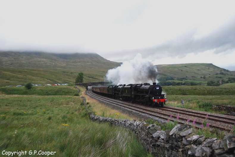 Britannia 70013 'Oliver Cromwell' was back in action 40 years later, as part of the reinactment of the end of BR Steam specials, on the outward leg of the Liverpool to Carlisle special, 10th August 2008. ©2008 G.P.Cooper.