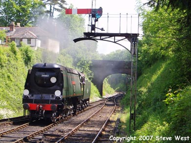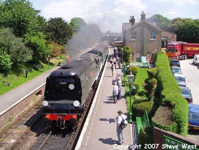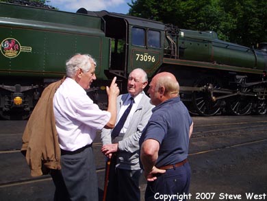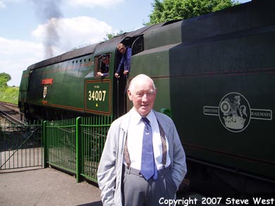Mid Hants Railway Visit May 2007On Wednesday the 23rd of May this year a visit to the Mid-Hants railway saw a reunion of a slightly different nature between our Nine Elms Enginemen's Reunion 'Patriarch', Tim Crowley, and Class 'West Country', 4-6-2, No. 34007 'Wadebridge' as they met again after many, many years. As a young Fireman at Nine Elms Tim fired to his then regular Driver, Len Rickard, whilst he was in the 'Pilot Gang'. Len actually hailed from Wadebridge in Cornwall before moving up to Nine Elms and the connection with the Nine Elms allocated locomotive, for obvious reasons, was founded. If the Running Foremen at Nine Elms could they would ensure Len and his mate had No. 34007 on their turn of duty. Tim remembers well the time, when during a somewhat heated exchange of views with an Exmouth Junction Driver at Salisbury, Len was derogatorily referred to as a 'cockney' to which he took great exception as a 'Cornishman', thus reminding his protagonist in no uncertain terms that as a 'Devon' he was far more of a 'cockney'! In additon to Tim, many other well known Nine Elms men also fired to Len over the years such as George Hawkins, Les Pitchell, Tim, Clive Groome, Ginger Bearham and Roger Caple to name but a few. Like everyone who knew Len they all paid the highest of tributes to this exceptional Engineman, a true gentleman. Jim Lester Here are a few photos from the visit (thanks to Steve West):