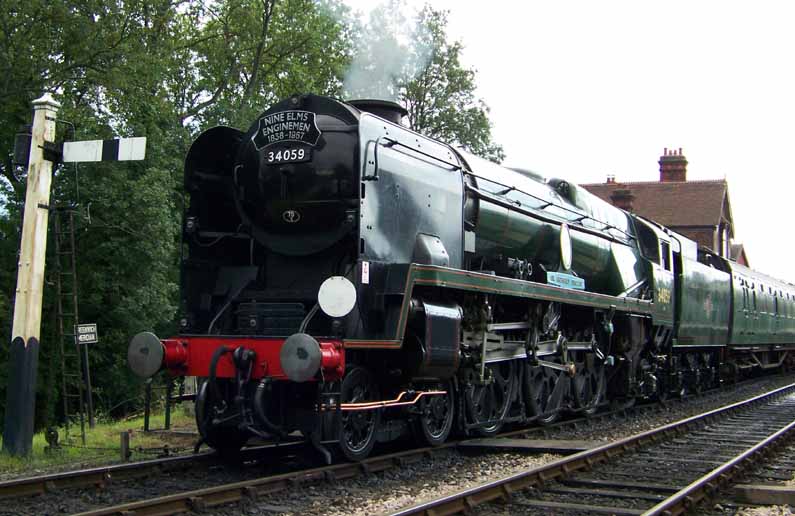 Peter Austin also wrote to the Shedmaster: Thank you, Jim and Tim for a really enjoyable day, I am sorry I did not manage to introduce myself to Tim and thank him for the invitation. It was such a pleasure to see and speak to the Guys who made my youth so enjoyable, namely Gordon Hooper who I have for so long wanted to speak to and personally thank him for the fireworks all those years ago!! I can only commend you, Tim and Jim for creating what you have on the website, it is truly unique, but Nine Elms deserves it's rightful place in history, and you have made sure that this is the case for posterity. Here is Peter Austin's photo 34059 with the Nine Elms headboard © 2010 Peter Austin.